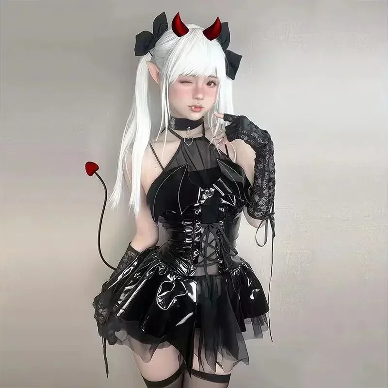 Cosplay costume Halloween Sexy Dress Little Devil Dress Festival Party Gift Patent Leather Strap Neck Hanging Dress Uniform Set