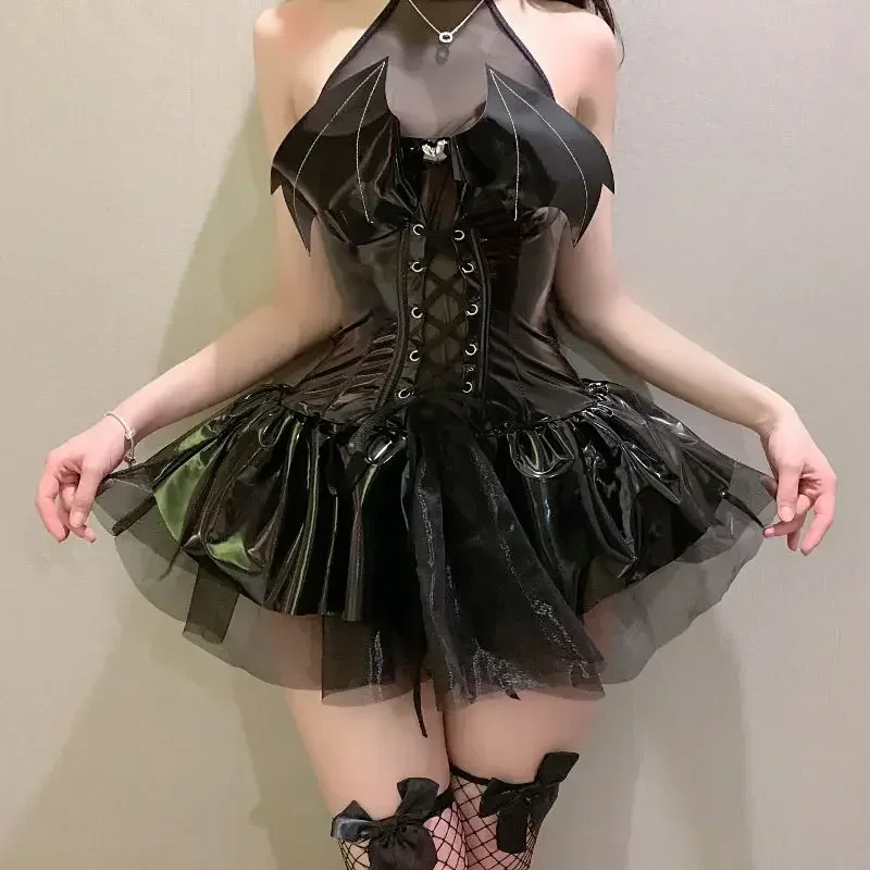 Sexy Cosplay Dress Women Bandage Hollow Out Bats Dress Punk Mall Gothic Clothes bodysuit Anime little devil sexy glossy uniform